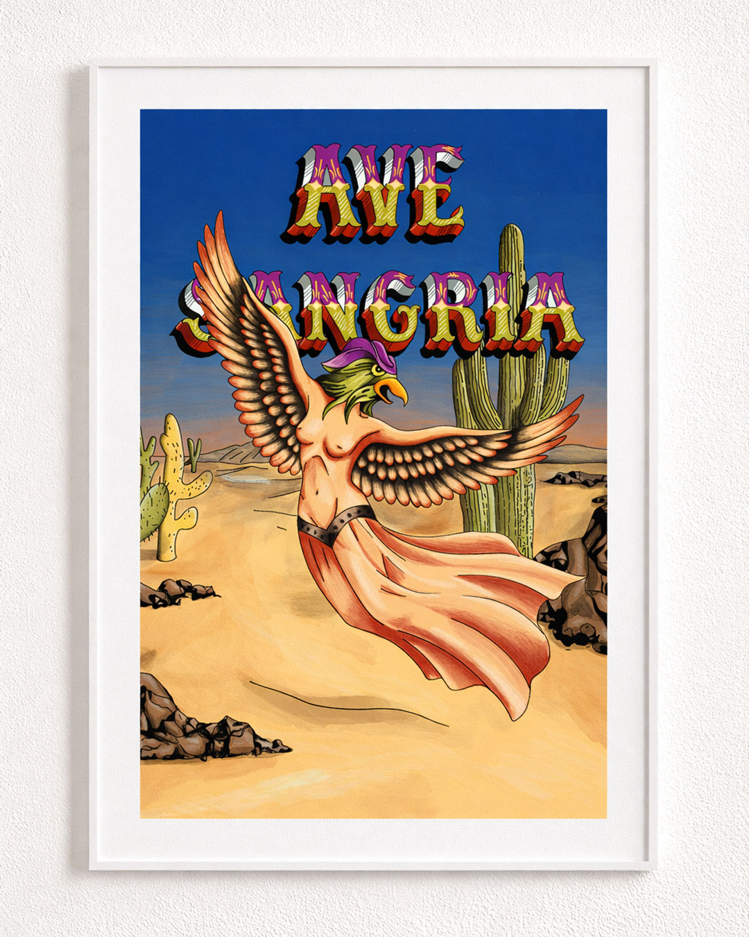 Ave Sangria é uma obra impressa assinada de Luiz, criada a partir do imaginário do álbum de estreia da banda Ave Sangria, lançado em 1974. A composição articula psicodelia, simbolismo e paisagem árida para traduzir visualmente o espírito libertário, experimental e inquieto que marcou o disco.